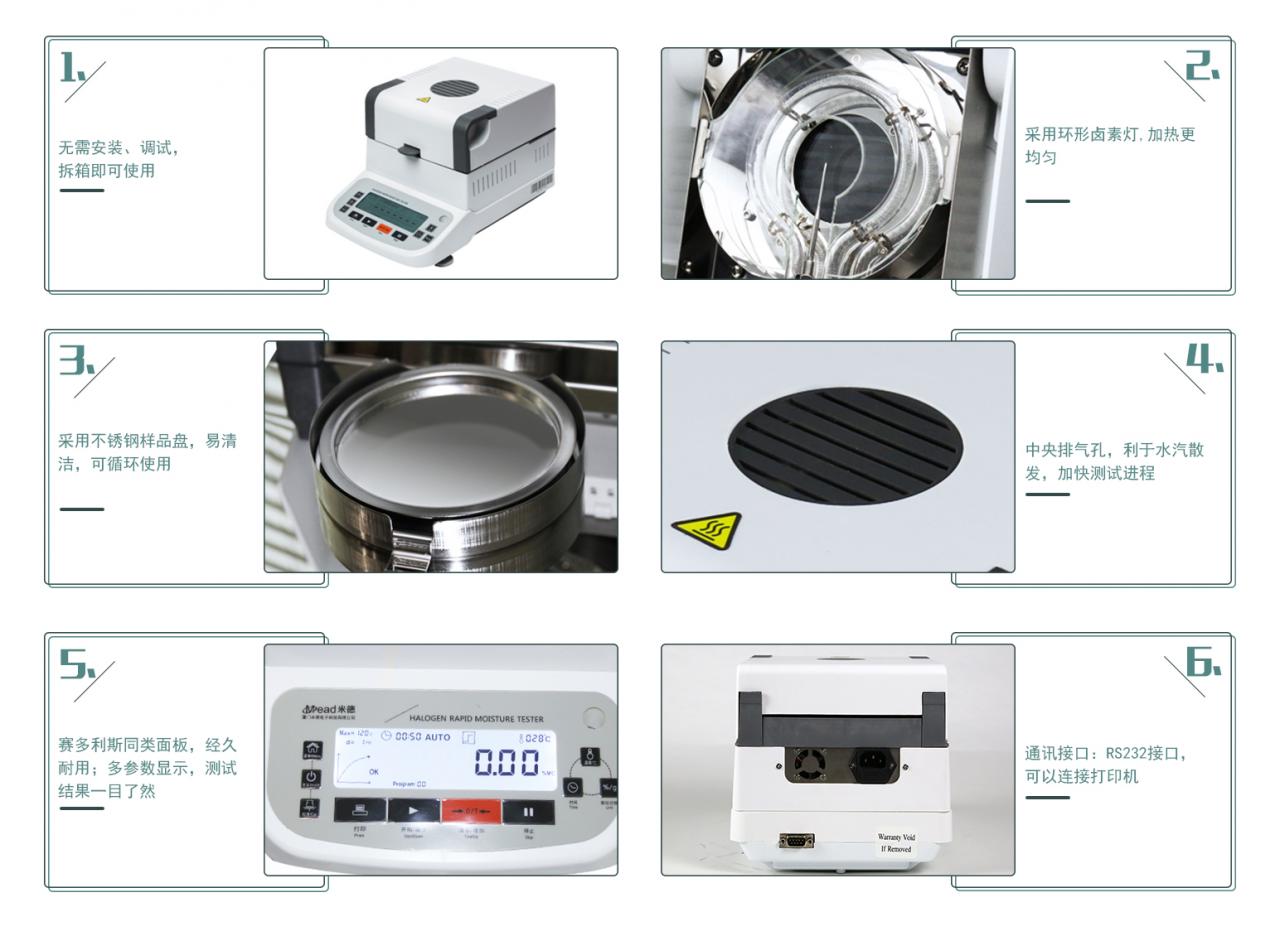 8.設計優良獨特溫控加熱系統結果更精準,實時曲線圖顯示,直觀觀察水分變化;